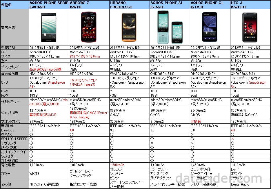 今回は全機種で最新のAndroid4.0 Ice Cream Sandwichが採用されます。が、恐らくインターフェースはメーカー独自のものに置き換えられているものと思われます。同じOSバージョンでも操作方法が若干異なることがありますので、購入前には一度しっかりと試してみたいところです。